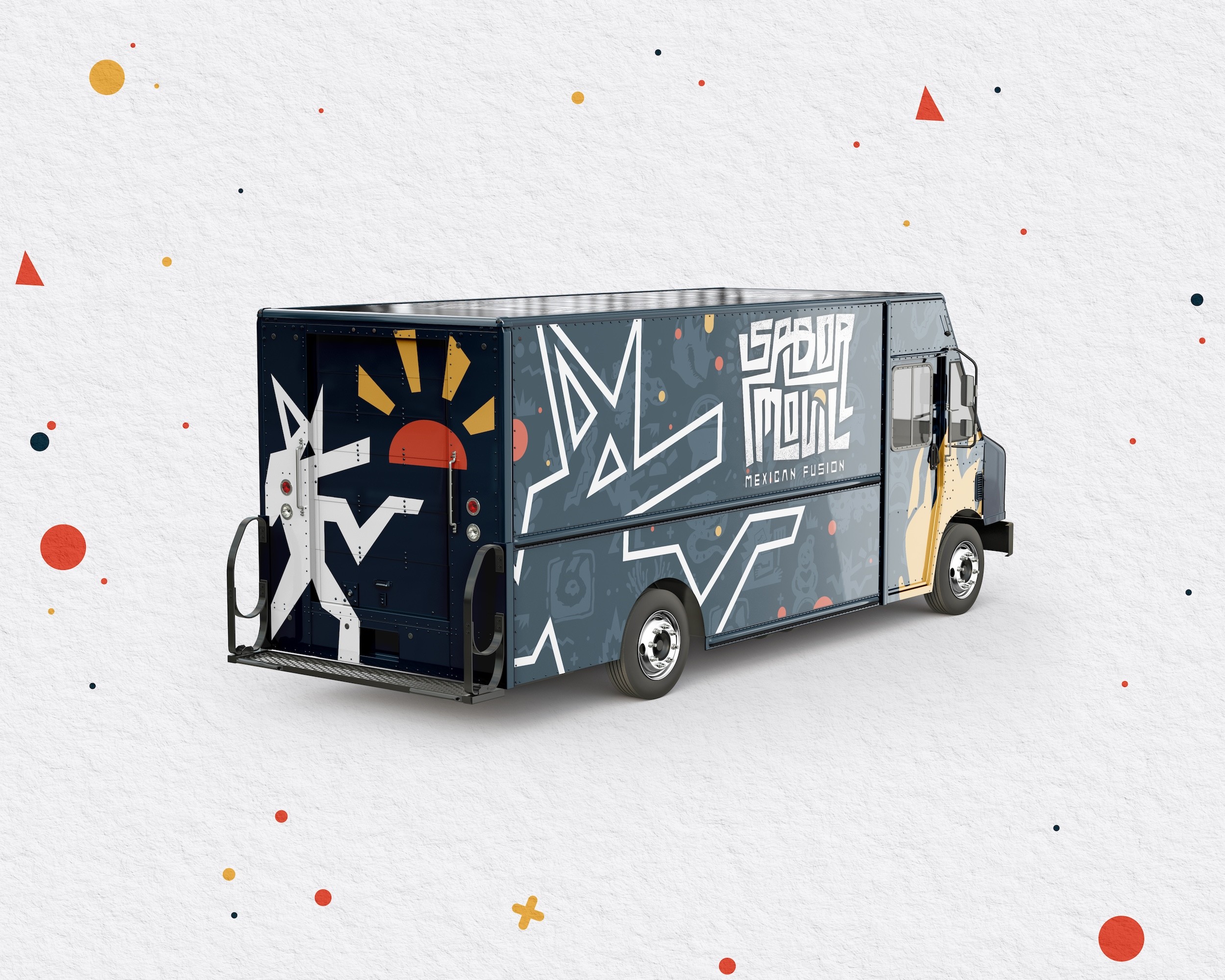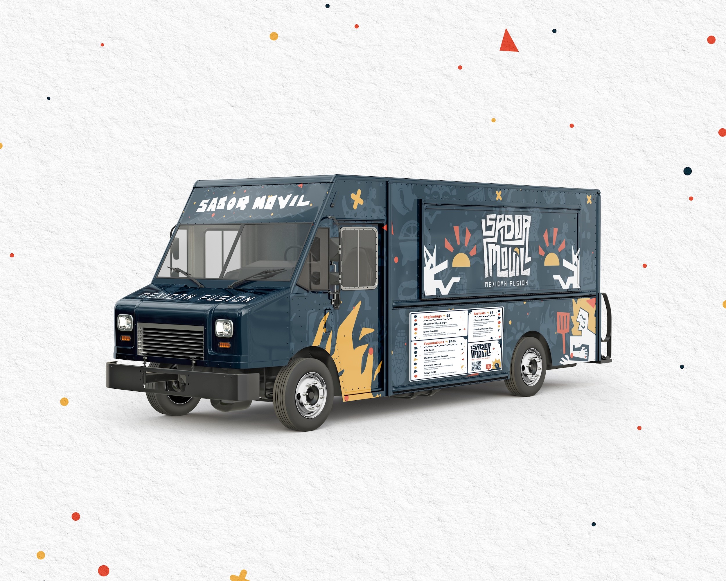 The identity uses a bold palette of deep blue, burnt orange, and yellow set against clean white surfaces to maximize visibility in busy urban environments. A modular illustration system built from cultural motifs such as chile peppers, coyotes, sun imagery, and maize creates a cohesive graphic language applied across packaging and the truck exterior.