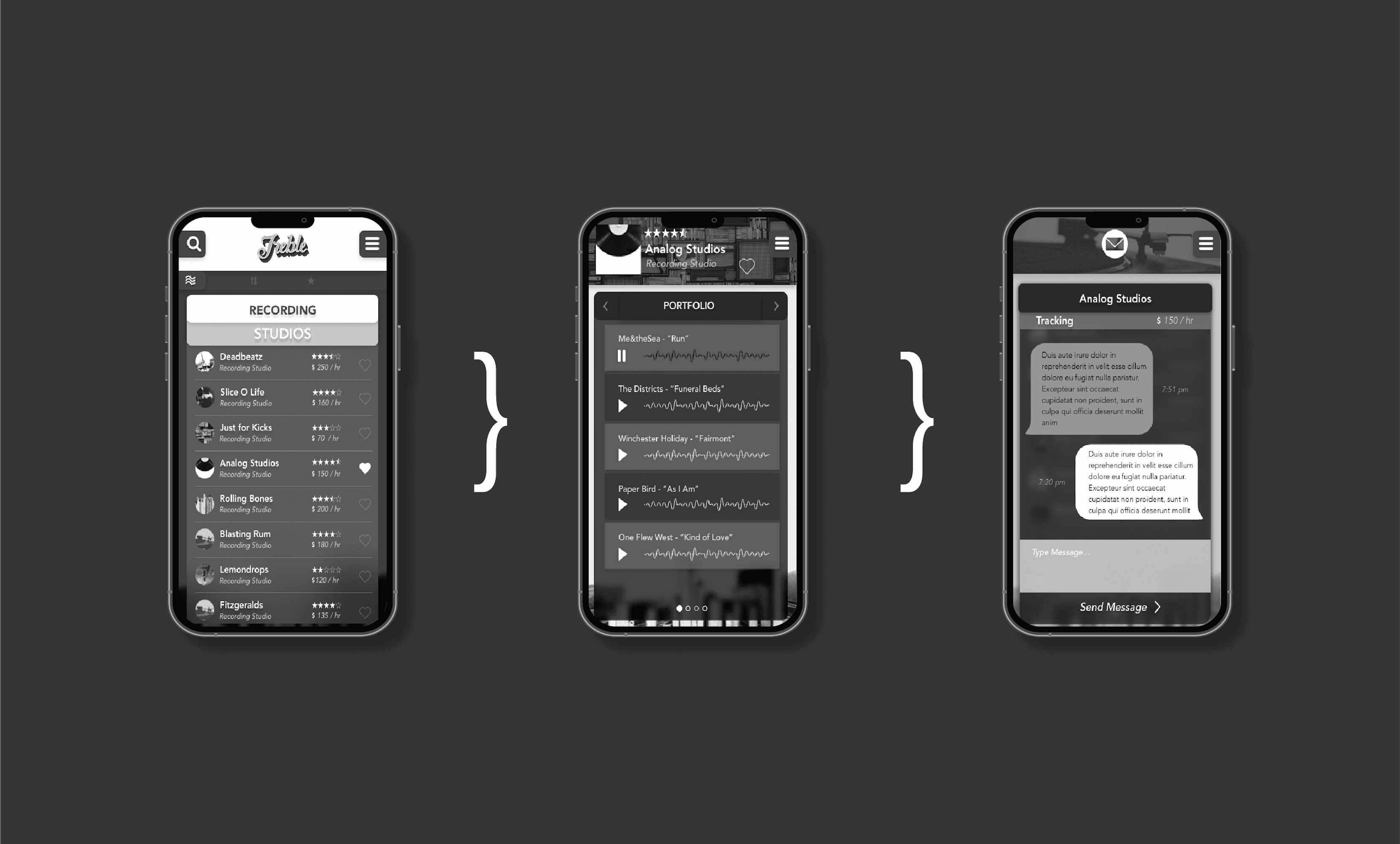 Treble functions as a portfolio-based networking application where users build profiles showcasing their skills, media, and services. Musicians and creatives can post opportunities, discover collaborators, and communicate directly within the platform. Wireframes and interactive prototypes were developed in Figma based on interviews with working musicians and creative peers. Features include media-rich profiles, messaging, service listings, and a review system designed to build trust and accountability within the community. The visual identity balances approachability and professionalism, positioning the platform as both creative and credible.